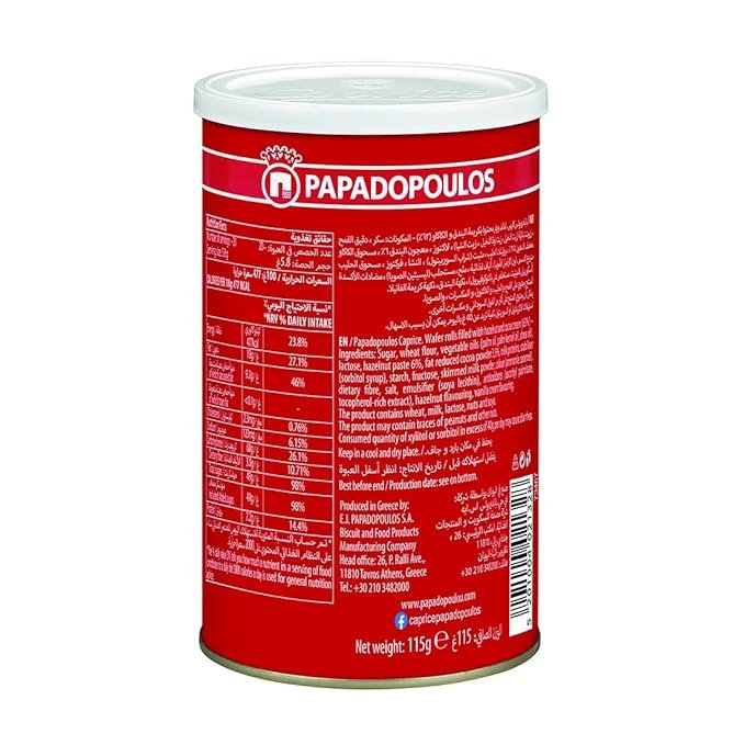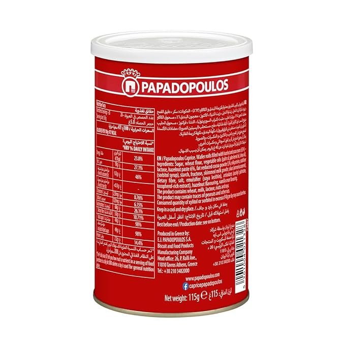 • Caprice Papadopoulos is a unique combination of crispy wafer and velvety filling of hazelnut cream and cocoa that melts in your mouth and delivers the ultimate treat.