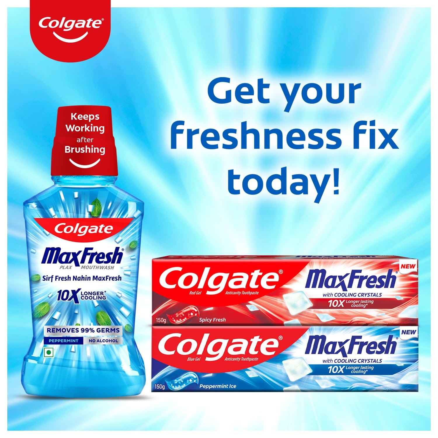 • Colgate Maxfresh toothpaste contains menthol that gives intense cooling and super freshness. It fights cavities, keeps germ build-up at bay and makes your teeth whiter on continuous use.