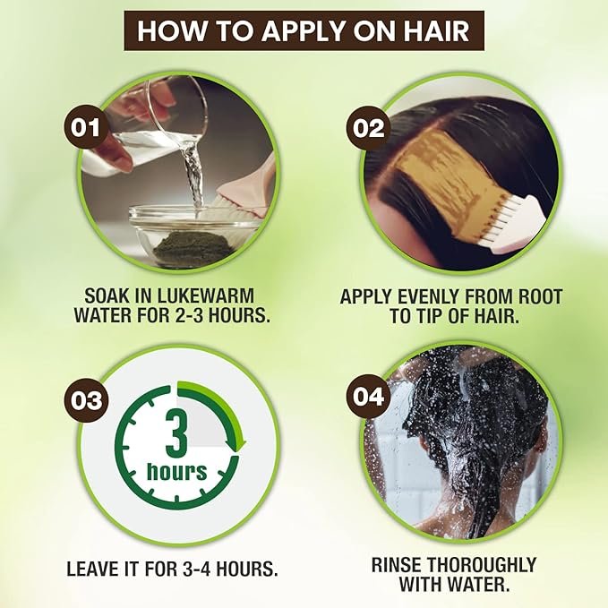 FOR HAIR: Soak Godrej Nupur Henna in lukewarm water for 2 – 3 hours. Apply evenly from root to tip. Leave it for 3-4 hours and then rinse thoroughly with water