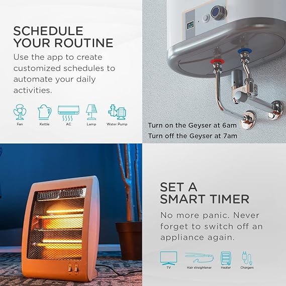 • Timer – No more panic. Never forget to switch off an appliance again by setting up a smart timer on them. You can conserve energy like in the case of ACs, heaters or also protect your devices from overcharging like in the case of phone and laptop chargers.