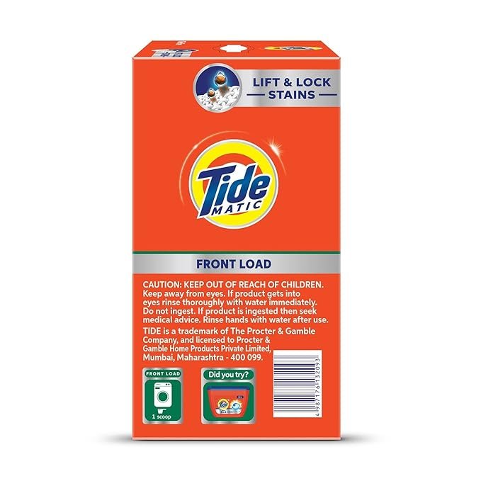 - New Lift and Lock Technology in Tide Matic Detergent Powder lifts the tough stains easily and locks them inside the machine and does not let the stains redeposit on to the clothes.